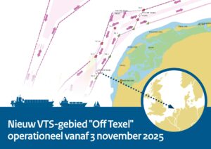 A new VTS is not very often introduced. However, the legislation has now been amended, personnel has been trained and equipment has been installed to enable adequate communication with passing vessels. From 3 November 2025, any vessel wishing to enter the “Off Texel VTS area” must report via VHF channel 63.